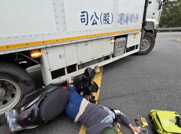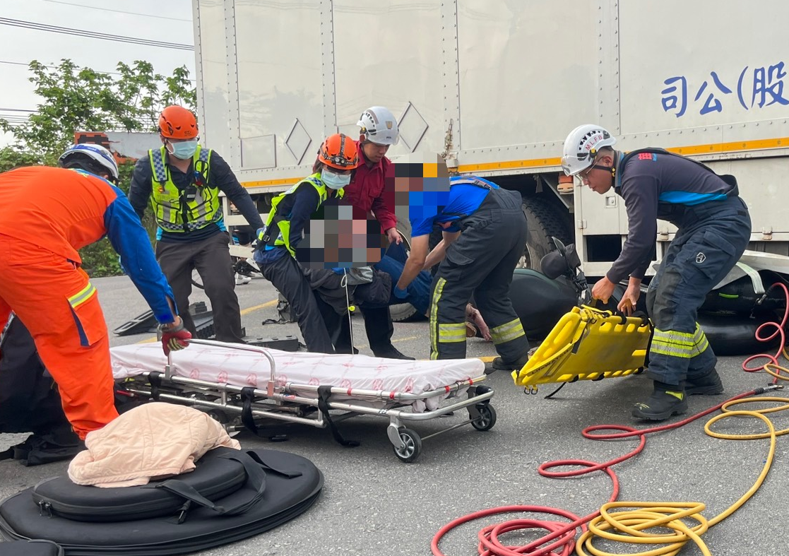 消防隊員到場發現,機車騎土59歲林姓婦人受困於貨車底部且腿部創傷。經搶救人員現場使用墊塊、葫蘆頂昇救援,將患者救出。患者雙腳疑似骨折,立即患肢固定,由救護車將患者送為恭醫院,後續由警方調查處理。