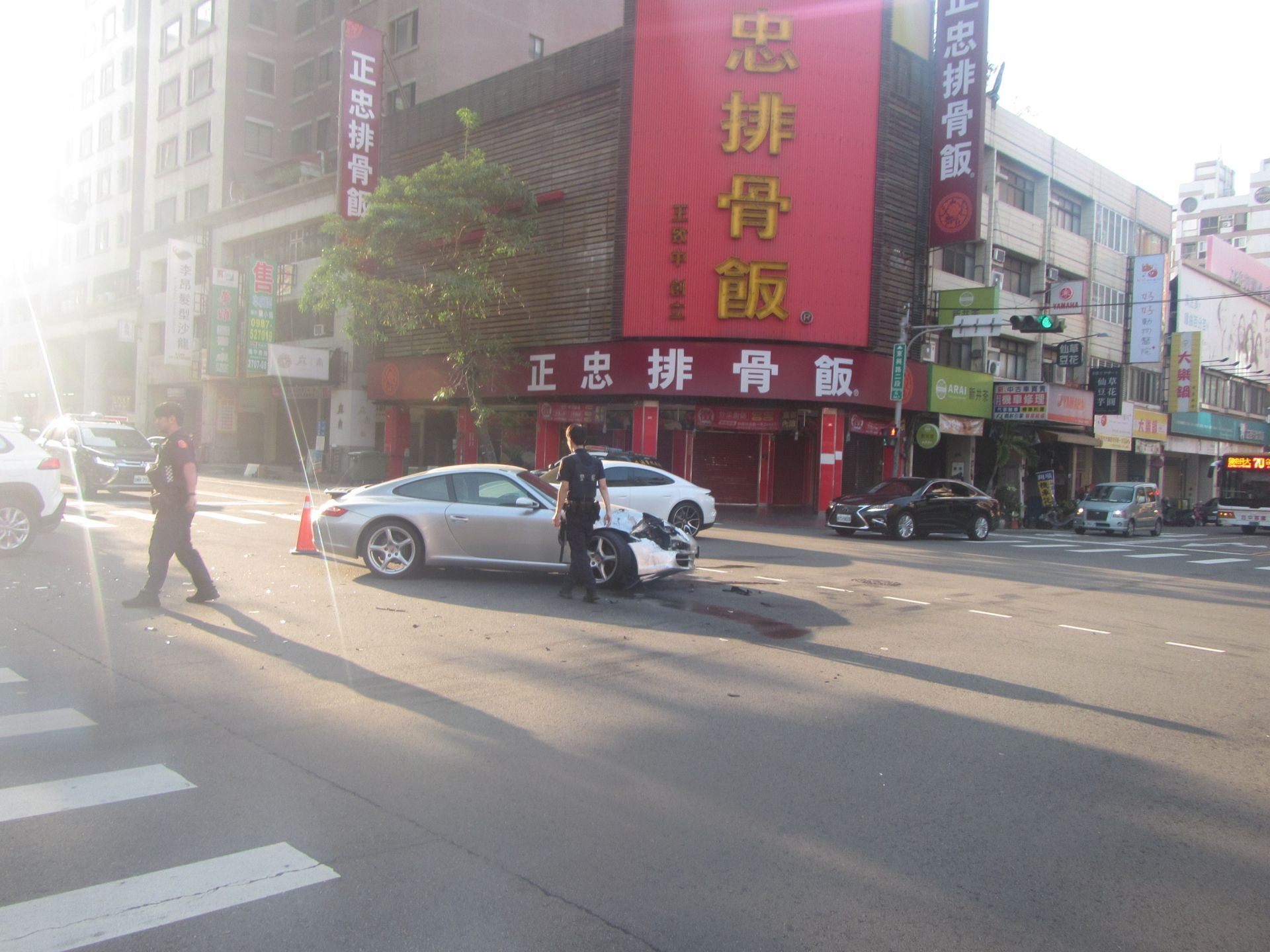 【Lai傳媒、記者爆料網/周庭慶/台中報導】1輛新車要價900多萬元的保時捷超跑,今(2)日清晨在台中市南屯區一處路口似闖紅燈,與一輛三菱休旅車相撞,保時捷旋轉270度、車頭及車燈毀損,引擎蓋變形,駕駛潘姓男子輕傷。男稱因為當陽光太刺眼未注意號誌,詳細肇事原因警方調查中。
