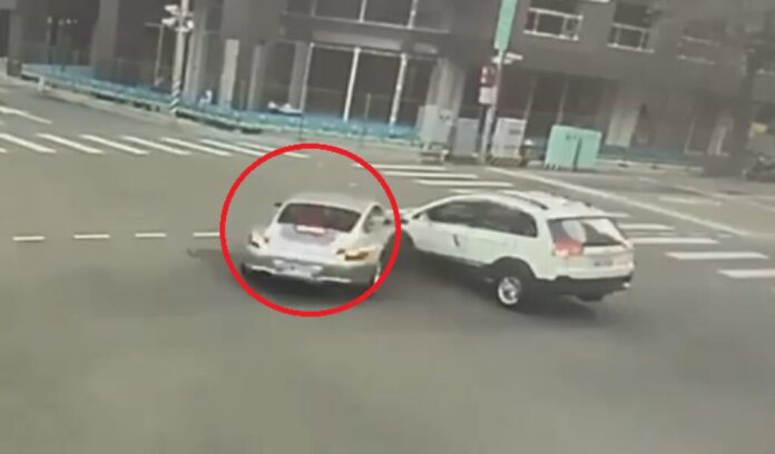 台中市路口保時捷(紅圈處)闖紅燈與三菱休旅車相撞。翻攝畫面