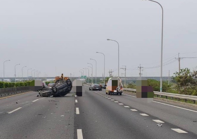 國道1號自小客車遭兩車撞擊翻覆。翻攝畫面