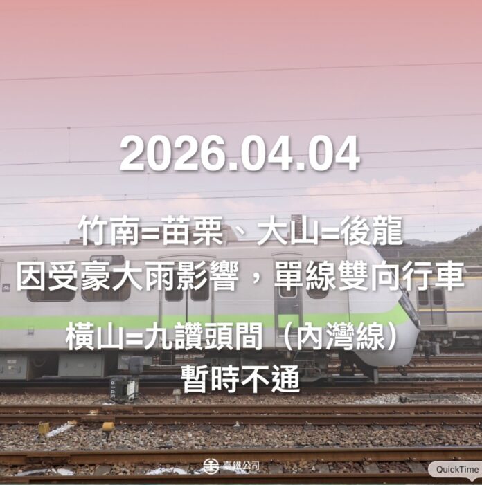 經工務回報目前苗栗=竹南間暫時以西正線雙向行車,為避免列車延誤擴大,部分南下列車將於竹南折返,部分北上列車將於苗栗折返,詳情行車資訊,請洽臺鐵官網及車站公告;另橫山=九讚頭間(內灣線)中豐公路平交道(K20+535)水淹軌面,路線暫時不通,本公司工務單位前往查看。