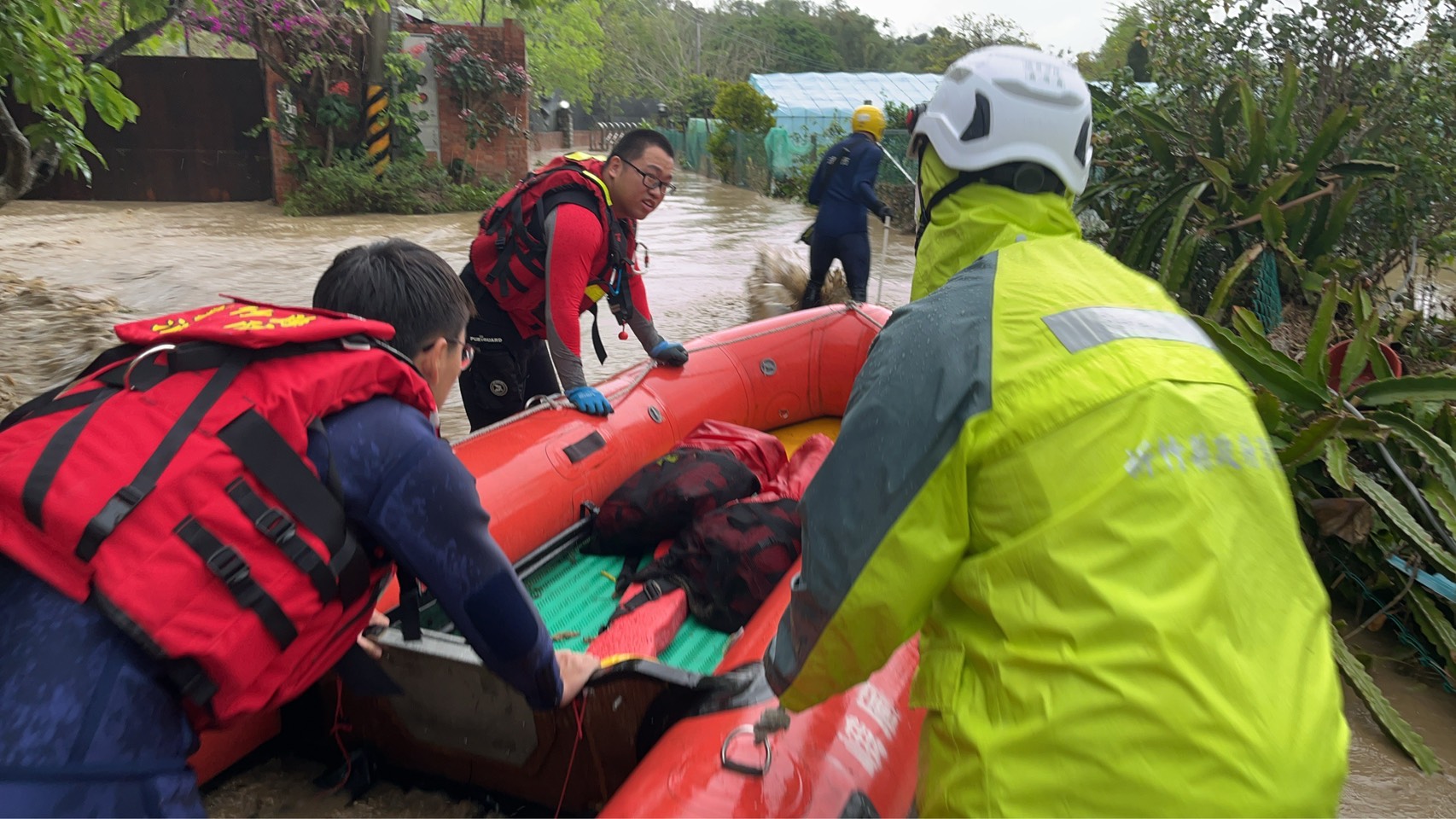 新竹縣消防隊員至淹水地區救援。翻攝畫面