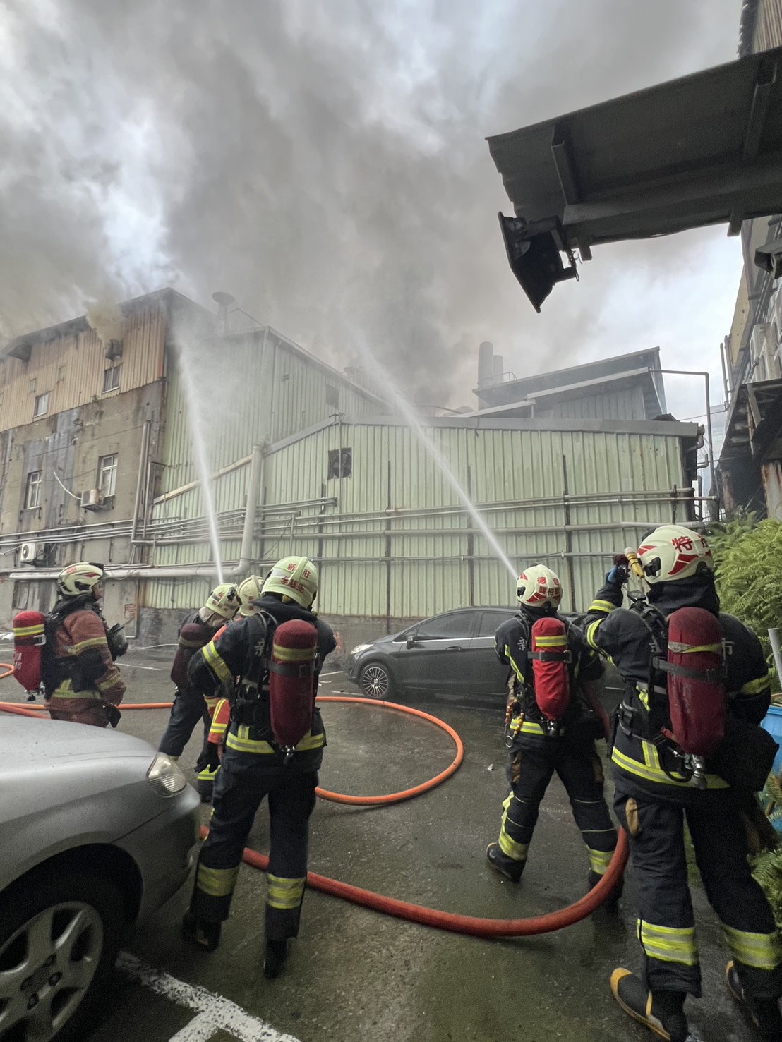 新北市新莊區5日上午發生工廠火警!新北市消防局16時54分獲報新莊區民安路2樓RC+3樓鐵皮建築物工廠火警,出動34車76人前往搶救。