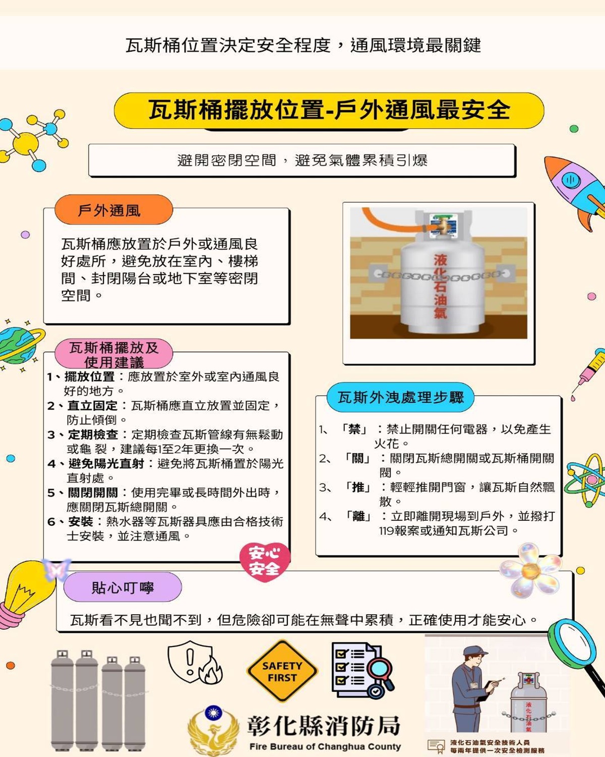 瓦斯桶擺放位置與通風環境直接影響安全程度,應放置於戶外或通風良好處所,避免設置於室內、樓梯間、封閉陽台或地下室等密閉空間,以防瓦斯外洩時於室內累積形成危險。瓦斯桶應直立放置並加以固定,平時定期檢查瓦斯管線與軟管是否有鬆動、龜裂或老化情形,原則每2年更換一次,並確保接合處穩固,以降低瓦斯洩漏及引發氣爆的可能性。