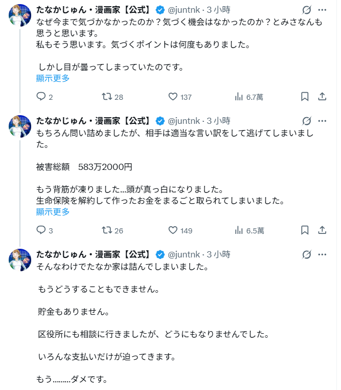 日本漫畫家田中淳,7日在自己的X(原Twitter)發文,坦承遭遇投資詐騙,並公開損失金額與詐騙手法,提醒大眾提高警覺。