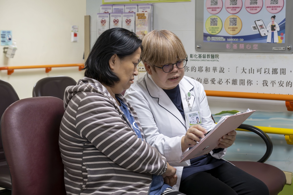 ▲梁鳳玲社工師(右)表示,謝先生治療成效佳,經轉介整合社福資源協助,減輕他們的醫療費用壓力。(圖/彰基提供)