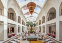 在這座「大學」裡,設計大師的巧思滲透進每一個角落,從化身為圖書館風格的典雅餐廳、充滿化學系實驗室色彩的特色酒吧,到仿舊講堂般的水療空間,每一處細節都充滿了藝術性與趣味性。而近日最受國際高端旅客矚目的,莫過於飯店精心策劃的庭院頂級料理饗宴。在飯店指標性的粉紅建築群環抱下,翠綠的草地化身為極致奢華的露天餐飲舞台,當夜幕低垂、暖黃色的串燈如星辰般在空中點亮,法式長桌在充滿異國情調的建築線條映襯下,散發出令人屏息的浪漫氣息。