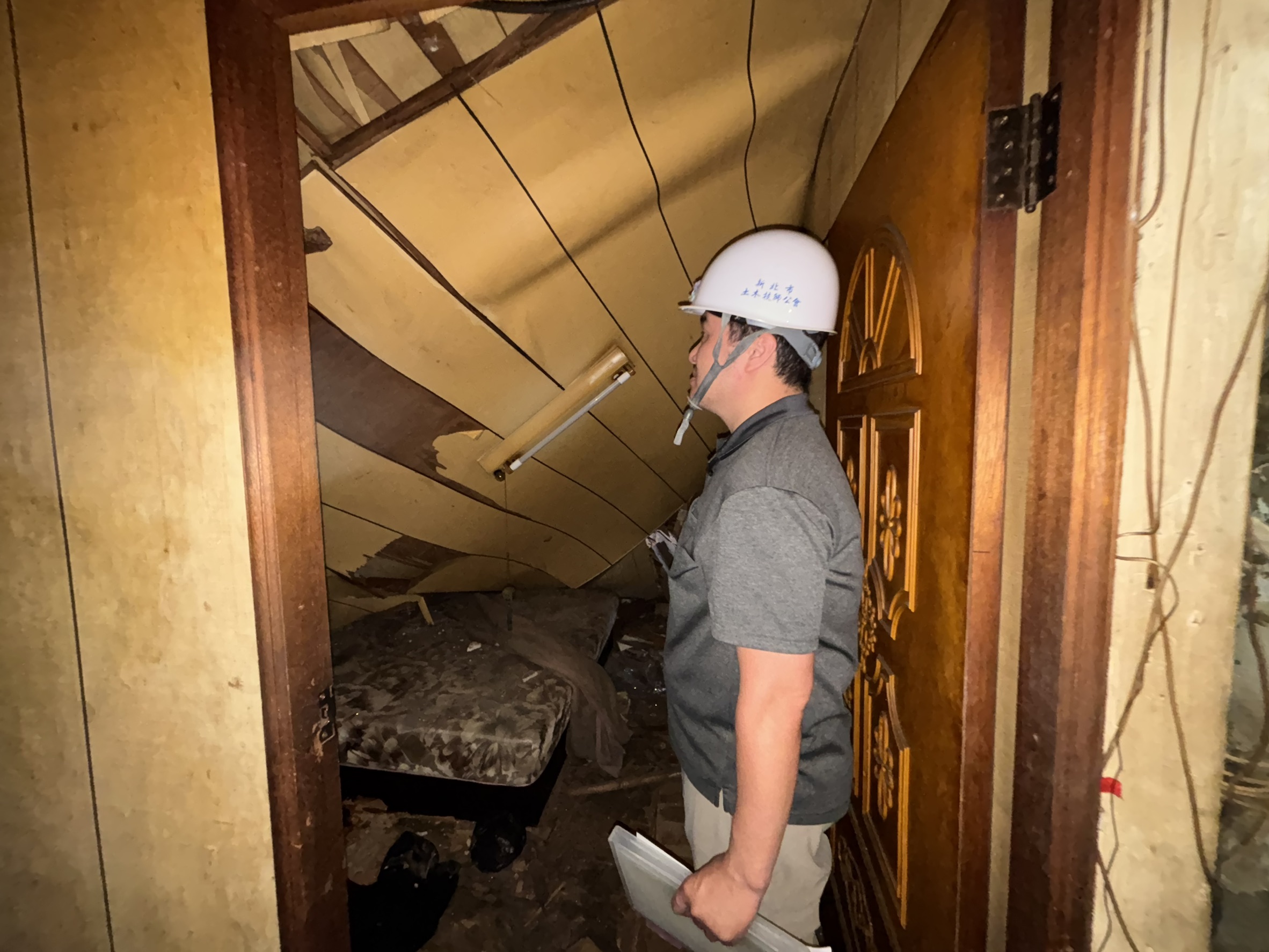工務局長馮兆麟指出,工務局第一時間獲報啟動應變機制,會同專業技師到場勘查,經勘查,現場建築物為加強磚造,屋頂為加蓋鐵皮包覆;2樓坍塌處為木構造橫梁腐朽,且天花板大面積掉落,建議清理後施作防掉落之安全措施,1樓經目視雖無立即危險,建議公所進行安置,以確保安全。