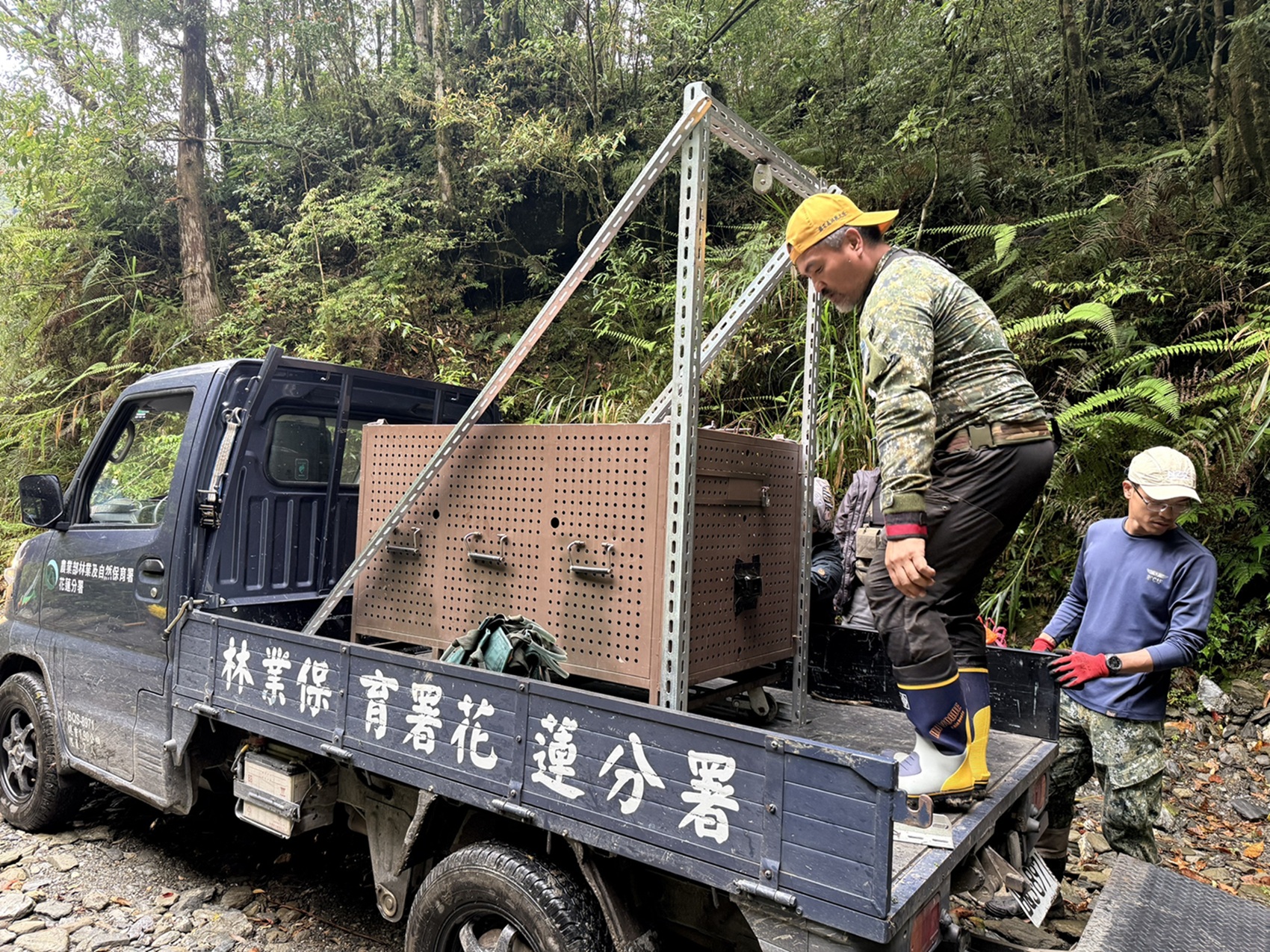 ▲林業署花蓮分署工作人員進行黑熊野放前整備作業,確保人熊安全。