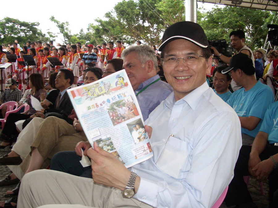 ▲2005年7月2日游錫堃手持童玩日報與秘克琳神父同框。(圖/仰山文教基金會提供)
