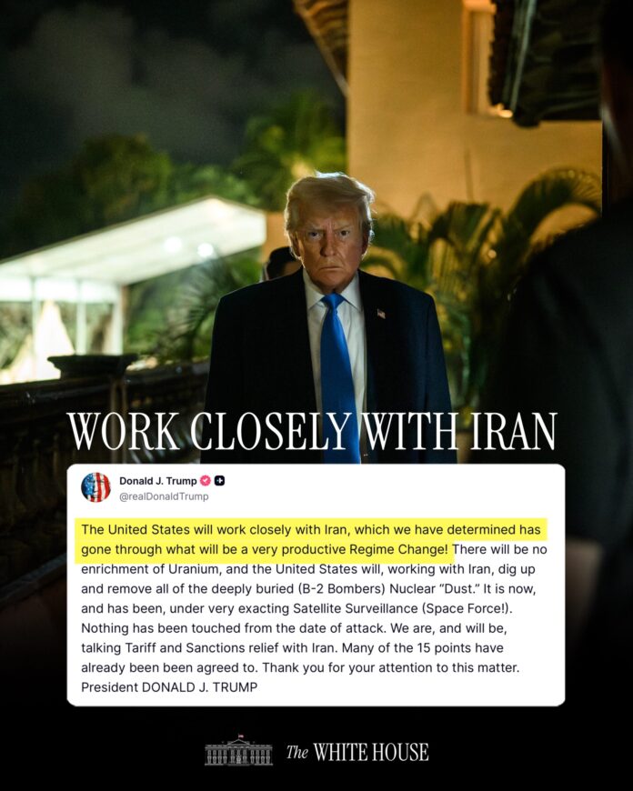▲美國總統川普宣布,美國將與已經歷「富有成效政權更迭」的新伊朗政權密切合作,雙方正就聯合清除伊朗境內深埋的核設施遺骸,以及提供關稅與制裁減免進行深入談判。(圖/翻攝自白宮官方X帳號)