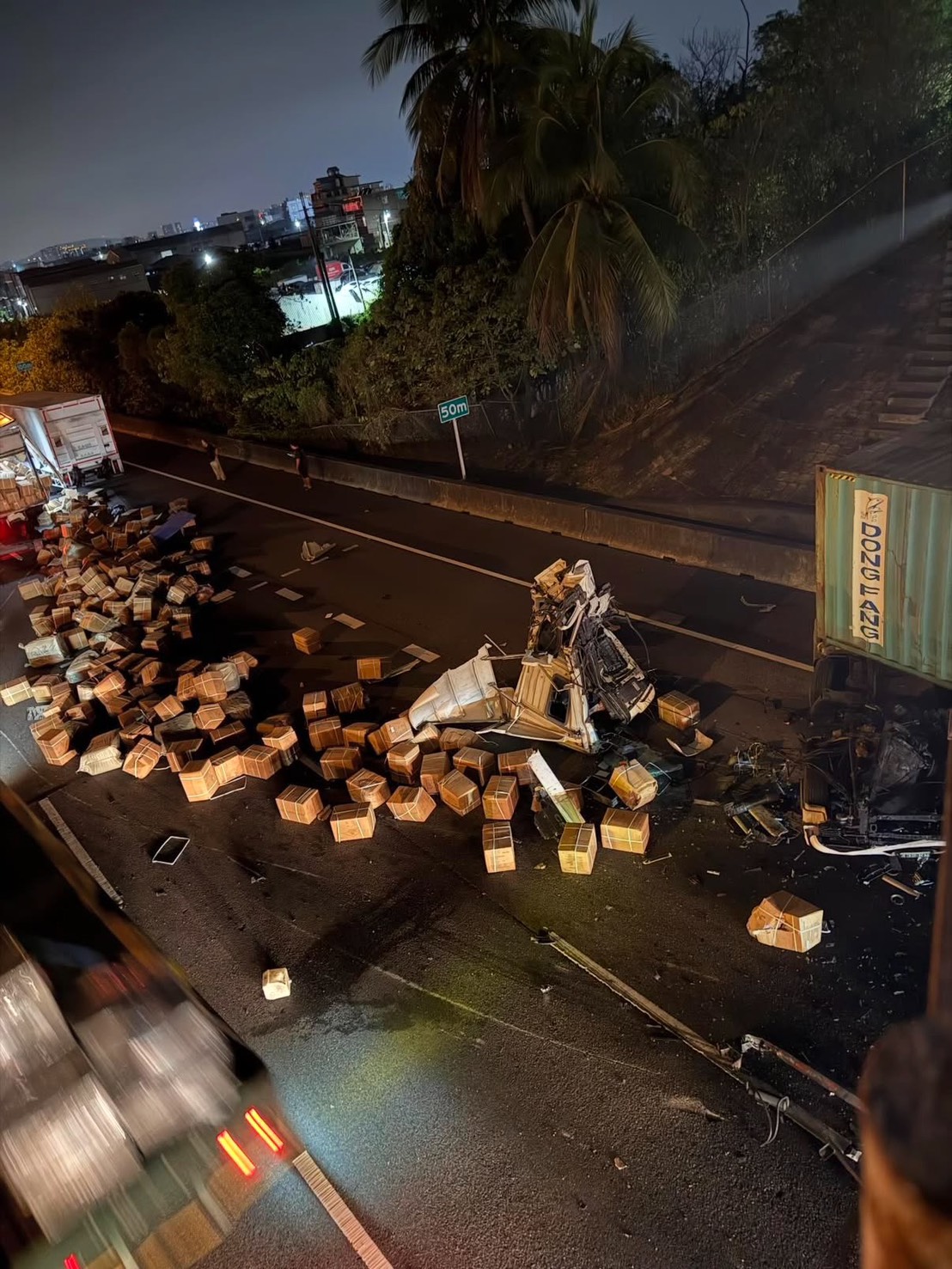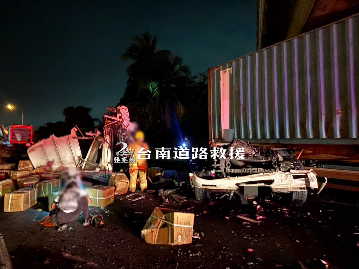 國道1號南下348.7公里岡山段今(8)日晚間9時許發生重大車禍,現場是聯結車發生事故,其中一輛車的車頭直接落地,據悉,駕駛受困車內,被救出時相當不樂觀,目前正送往醫院搶救當中,至於詳細車禍原因仍有待進一步釐清。