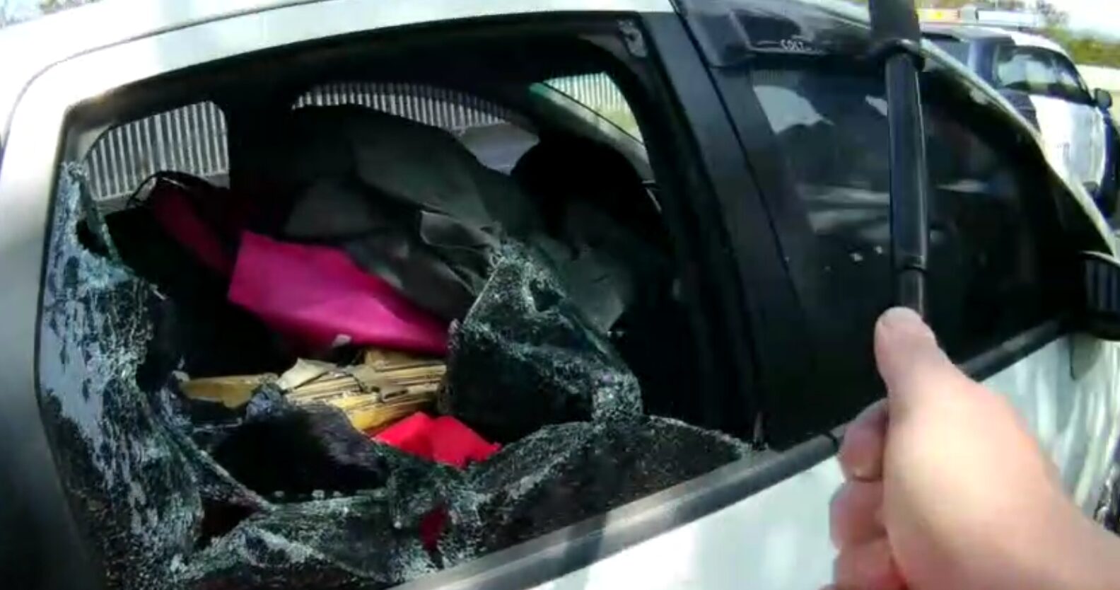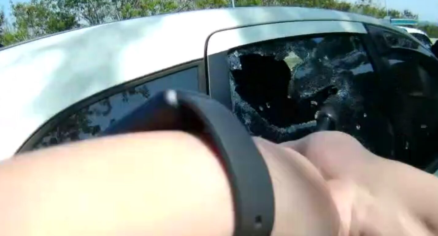 警方敲破車窗開車門救出受困車內女嬰。翻攝畫面