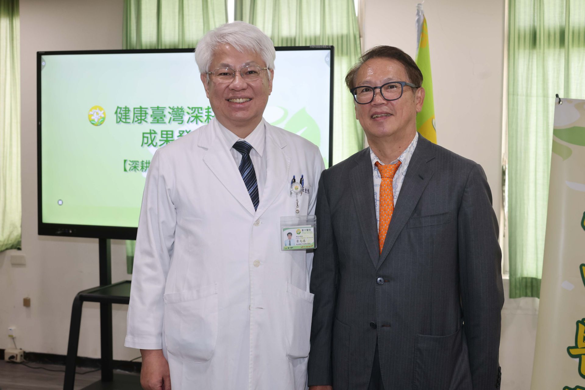 衛生福利部臺中醫院黃元德院長(左)與台中市醫師公會副理事長林恒立醫師(右)接受媒體訪問。