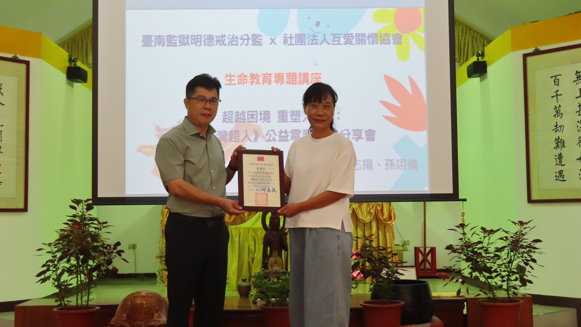 最後,張美紅理事長勉勵收容人「生命不是是非題,而是思考題,因為你我,都是創造者,我們不用知道她人的曾經,但是要知道我們的未來」,今日透過播放紀錄片《台灣超人》的觀賞及劇中人物的現身分享,為這群收容人注入了一道溫暖且充滿希望的陽光。