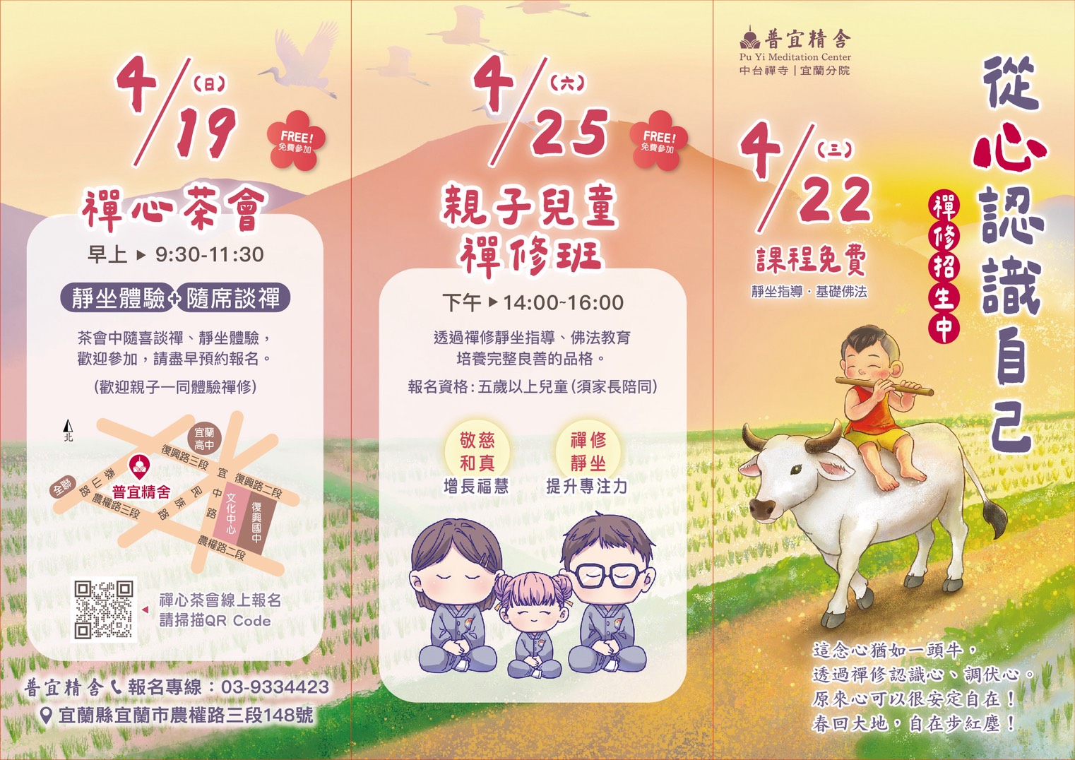 為將禪修理念落實於生活之中,普宜精舍將於 4月19日(日) 上午舉辦 「禪心茶會」,包含靜坐體驗與隨席談禪。此外,4月22日(三) 起也將開設「成人初級禪修班」,提供日間與夜間課程,歡迎民眾踴躍參與,一同探索內在的力量。