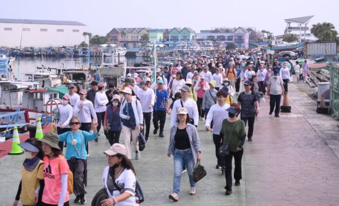 花蓮縣政府在花蓮漁港觀光魚市舉辦「減碳呼吸,健走趣」活動。(圖∕花蓮縣政府提供)