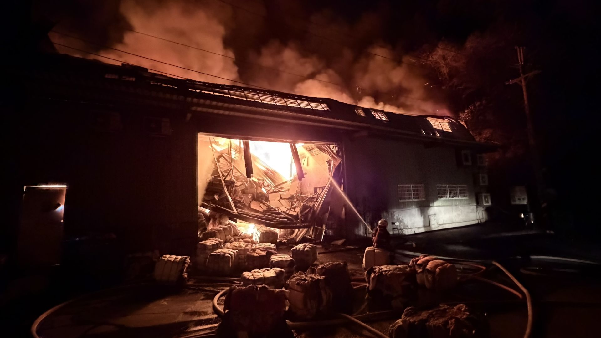 火警現場存放大批舊衣等易燃物火勢兇猛且迅速延燒。翻攝畫面