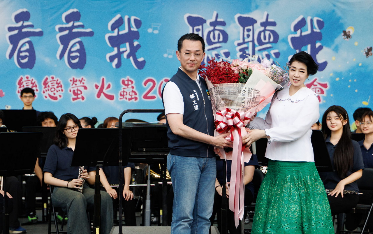 ▲臺北市政府林士斌副秘書長獻花給製作人聲樂家簡文秀。(圖/億光文化基金會提供)