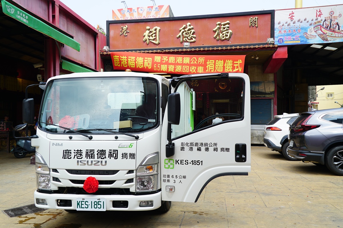 鹿港福德祠管理委員會主委施炳坤表示,有鑑於鹿港清潔隊對於地方垃圾處理清運的辛勞,特地購贈一台「6.5噸升降尾門傾卸式資源回收車」,這台資源回收車,配備有液壓升降尾門與自動傾卸功能,不僅能大幅降低清潔人員搬運回收物的負擔,並縮短作業時間,讓資源回收流程可以有效提高更效能。