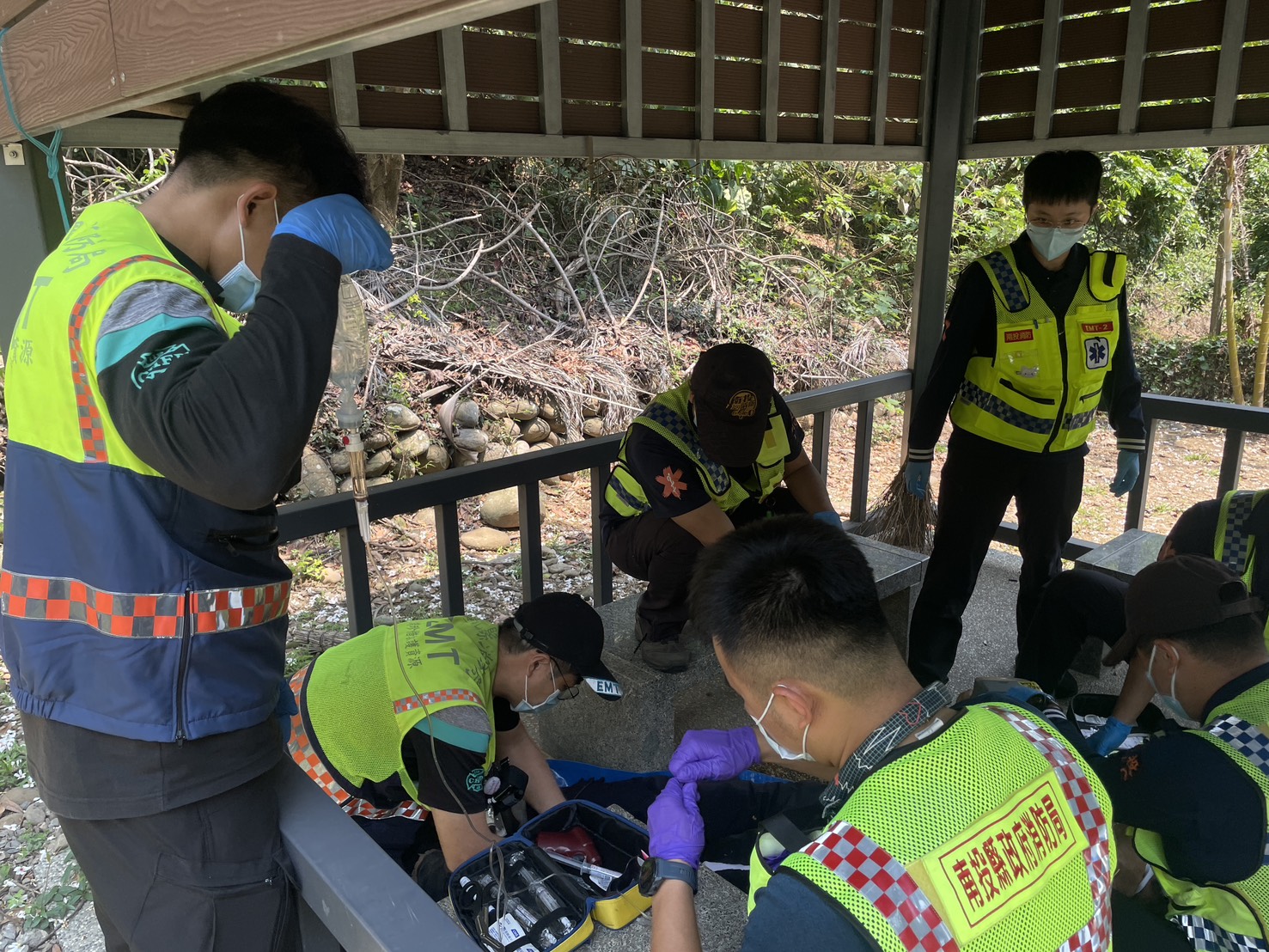 【Lai傳媒、記者爆料網/周庭慶/彰化報導】彰化縣與南投縣消防局4月12日上午完成跨縣市救護接力!上午10時左右,南投縣消防局中心接獲報案,芬園鄉挑水古道有民眾倒地。現場友人除撥打119求救,並在派遣員指導下立即實施心肺復甦術(CPR)。消防局考量患者可能需要長距離搬運,因此派遣3輛救護車及9名救護技術員出勤。由於轄區位於彰化縣,因此立刻轉報彰化縣消防局,得知為OHCA患者,彰化縣也立刻派遣芬園分隊1名高級救護技術員及2名救護技術員出勤,形成現場12位救護人員聯手急救1位患者的特殊場景。