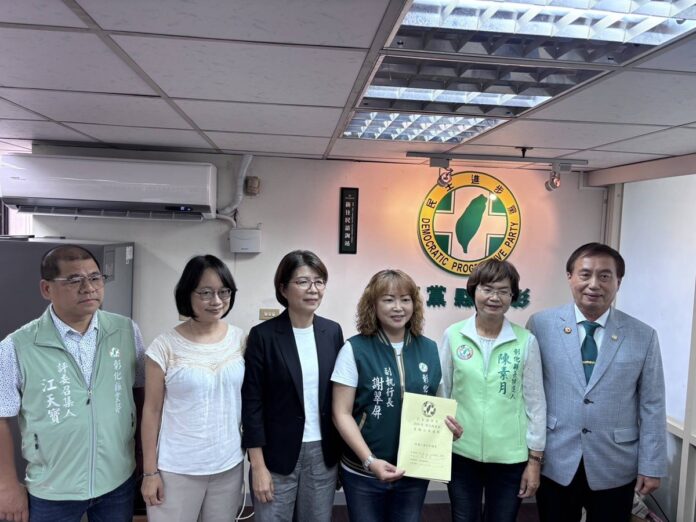 民進黨彰化縣黨部五月舉行黨職選舉,今日由彰化縣長候選人陳素月擔任隊長,與所有黨公職陪同謝翠屏同志參與主委選舉登記。(圖/記者蕭麗鳳攝)