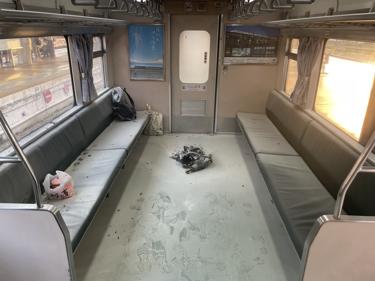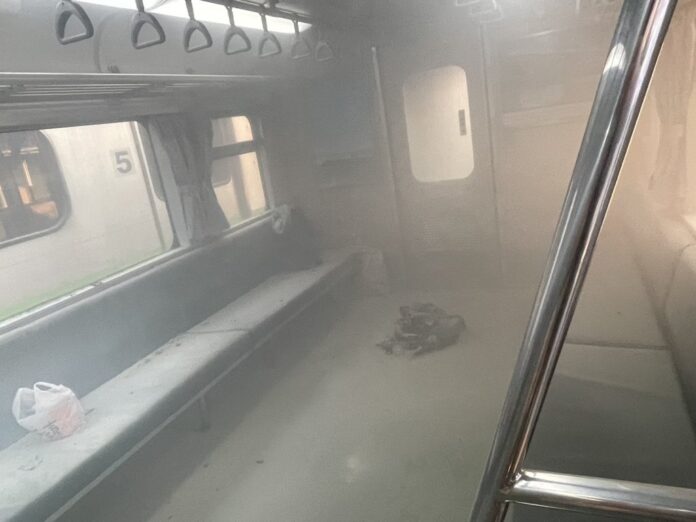 台鐵內灣線列車內旅客行動電源自燃,列車長迅速撲滅火勢現場仍煙霧瀰漫。翻攝畫面