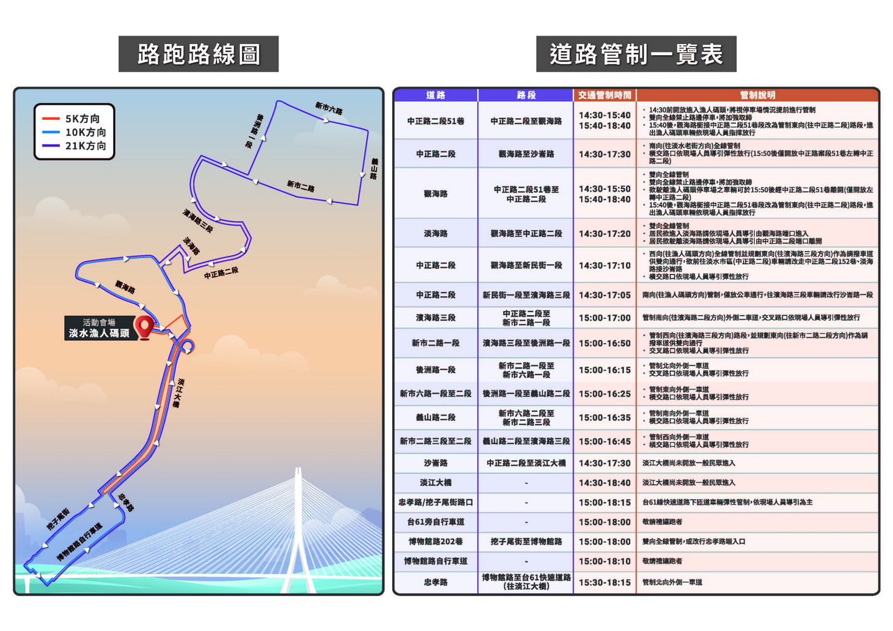 一、自行開車由淡水方向,前往活動會場周邊停車場者,請於中正東路一段路口靠右直行淡金公路,走新市政由沙崙路接回漁人碼頭方向,行車時間預計變為40分鐘左右,請跑者預先規劃行程。