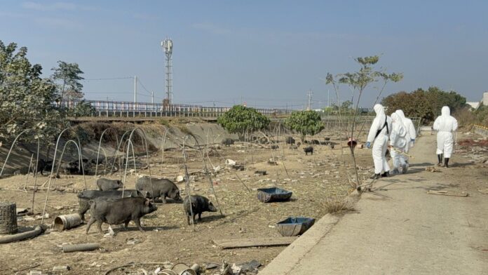 ▲家畜所前往消毒,並進行豬隻健康監測。(圖/嘉義縣政府提供)