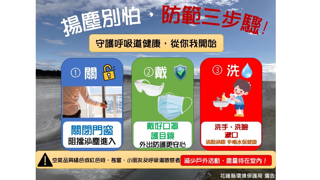 花蓮常出現「河川揚塵」現象,花蓮環境保護局請鄉親記住簡單的關、戴、洗「防塵三部曲」,便能守護自己與家人的健康。