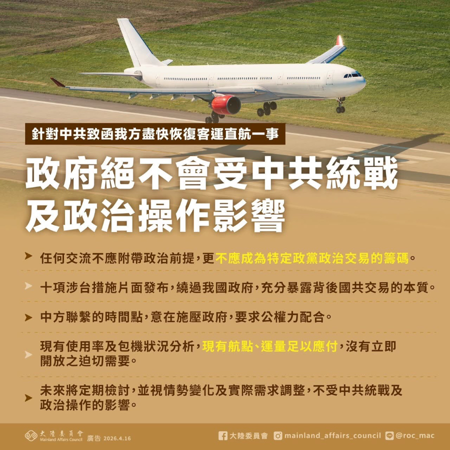 鄭習會後,中共發布十項涉台措施,其中包括推動全面恢復兩岸空中客運直航正常化,大陸委員會今天證實,4月7日收到陸方來函要求盡快恢復客運直航,強調政府支持健康有序的兩岸交流,任何交流措施不應附帶政治前提,更不應成為特定政黨政治交易的籌碼,未來將定期檢討,視實際需求調整。