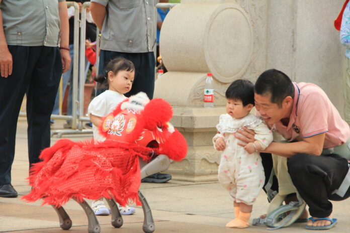 ▲套上醒獅服的機器狗,令小朋友很好奇。(圖/記者洪肇君攝)