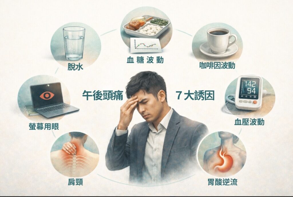 下午頭痛常見生活誘因有哪些?(咖啡因、脫水、血糖、螢幕、肩頸、胃酸、血壓)