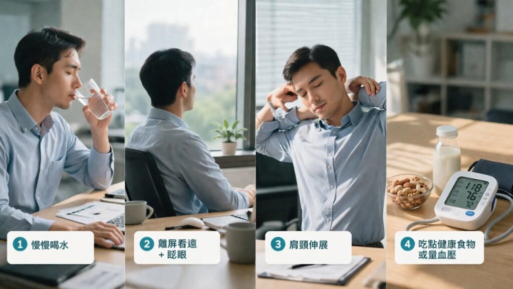 - 先做 3 件事:喝水(300–500ml)→ 走動 3 分鐘 → 眼睛遠望+眨眼