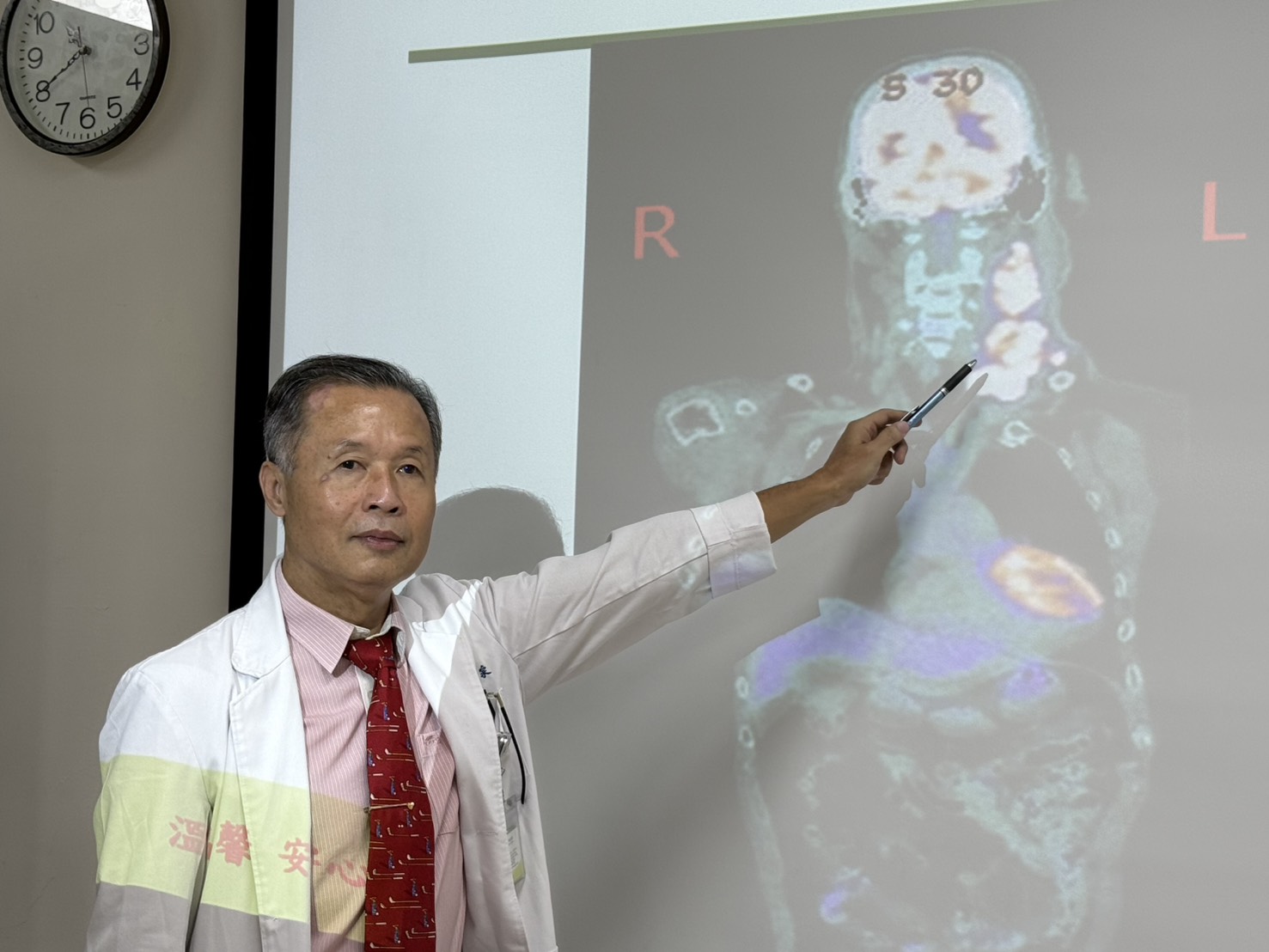一週後安排全身正子攝影(PET-CT)檢查,想找出原發性腫瘤的源頭,但檢查結果仍未發現原發腫瘤位置,醫療團隊只好針對頸部腫塊進行切片檢查,確診該腫塊為「轉移性鱗狀細胞癌」。