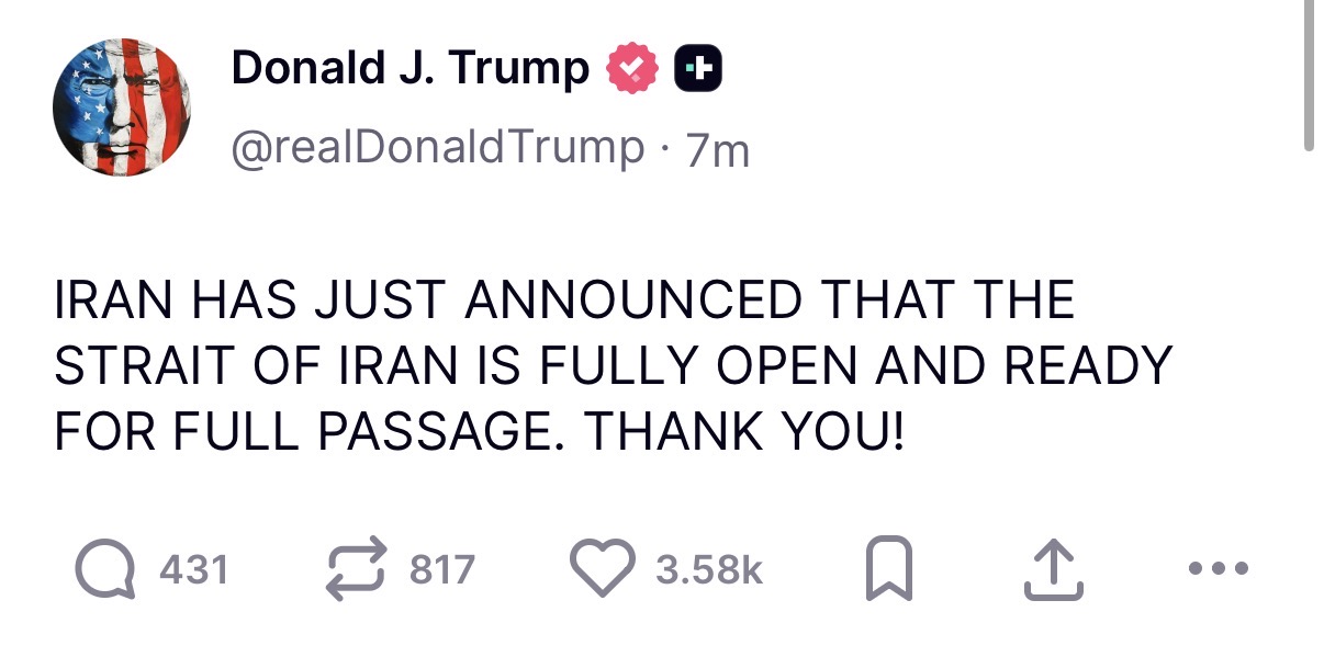 美國總統川普稍早則是在自家社群「Truth Social」發文表示,「伊朗剛剛宣布,伊朗海峽已全面開放,Thank you!」