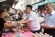 ▲陳素月與卓榮泰院長一行人吃豬肉,以行動力挺豬農。(圖/陳素月競辦提供)