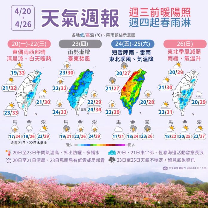 中央氣象署公布本周天氣重點,分成兩階段變化「由晴轉雨」,周三前暖陽照、周四起春雨淋。馬祖得留意局部霧、東半部海濱防長浪。