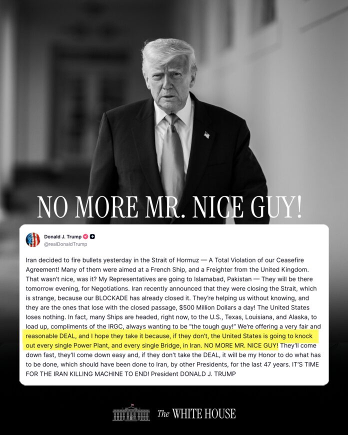 ▲美國總統川普於 Truth Social 發布嚴厲聲明,針對伊朗昨日在荷姆茲海峽攻擊英法船隻並違反停火協議一事,正式宣告「好人當夠了」(NO MORE MR. NICE GUY!)。(圖/翻攝自白宮官方X帳號)