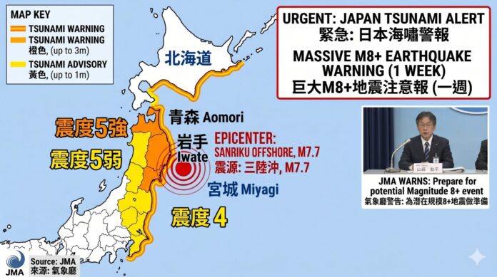 日本東北與北部地區於週一傍晚遭遇規模 7.7 強烈地震襲擊,引發太平洋沿岸長達數小時的海嘯警戒,並觸發了日本政府極為罕見的「巨大後發地震」預警機制。