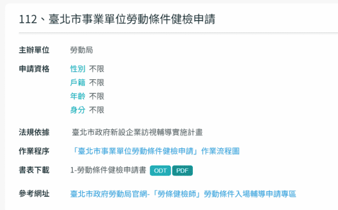 王秋冬局長呼籲,為協助雇主遵守法令,臺北市勞動局推出「勞條健檢師」的服務,雇主可透過「臺北服務通」(【連結】)提出線上申請,或至勞動局勞動權益中心臨櫃申請,勞動局的「勞條健檢師」將會主動向申請人確認輔導時間並提供服務。