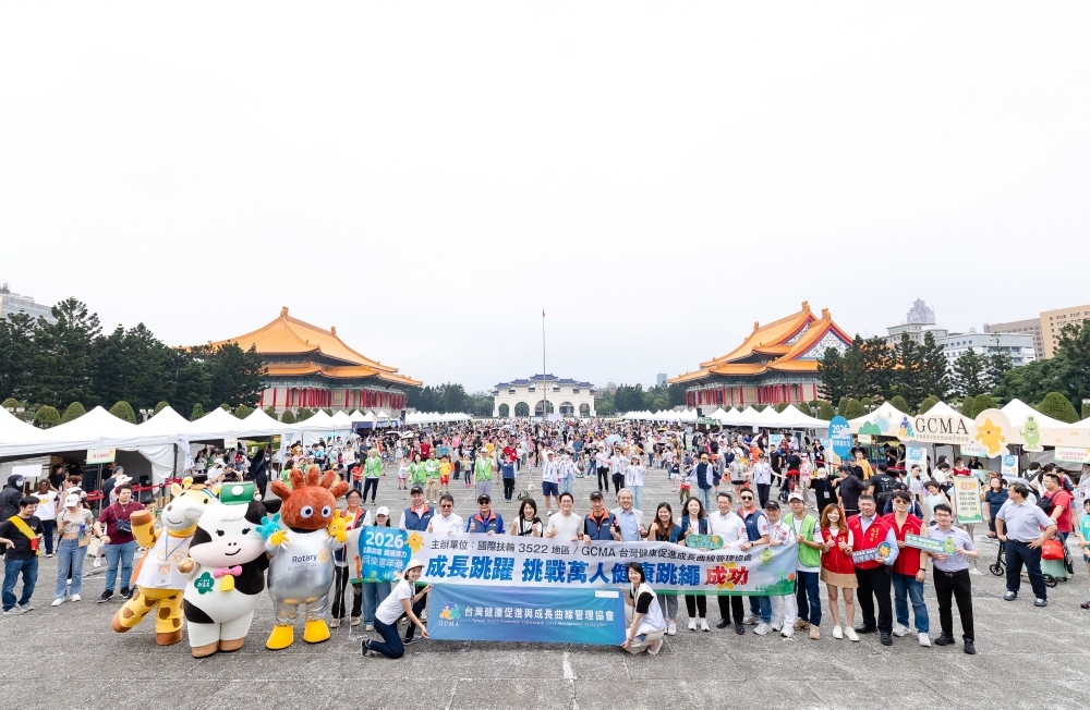 萬人同場跳繩、畫面震撼全城!由台灣健康促進成長曲線管理協會(GCMA)與國際扶輪3522地區首度攜手聯合主辦的「2026 成長跳躍 健康接力 同樂嘉年華」,於4月18日在中正紀念堂民主大道盛大登場。現場湧入大量親子家庭,共同完成壯觀的萬人跳繩畫面,不僅展現全民投入健康生活的行動力,也讓親子健康議題成為城市焦點。