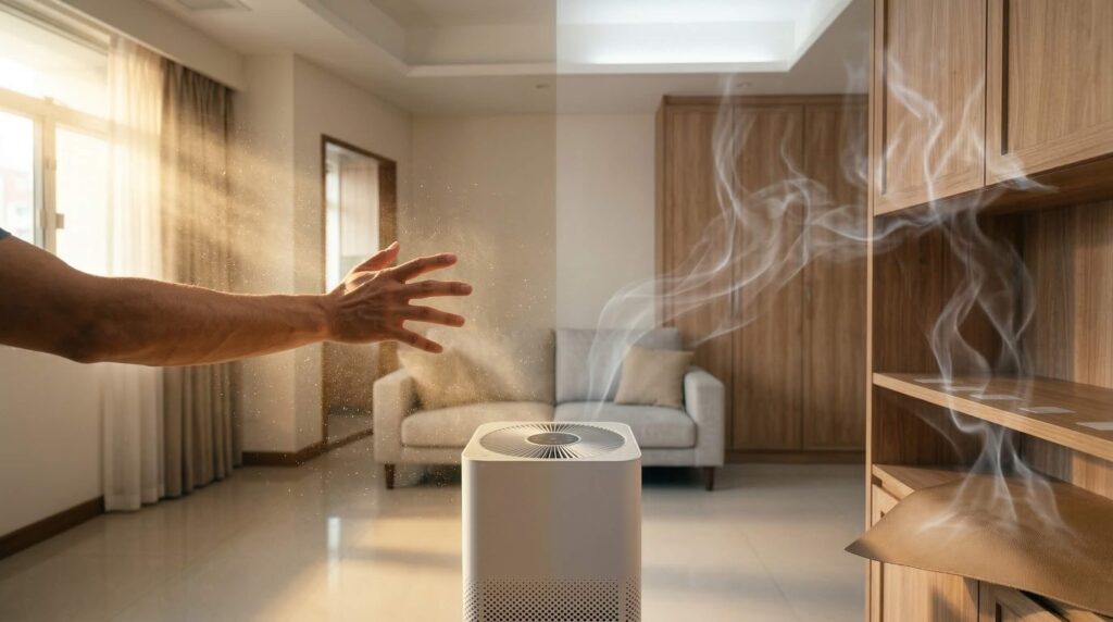 因為很多裝潢味不是顆粒,而是氣態污染物。HEPA 比較擅長處理粉塵、花粉、懸浮微粒這類顆粒;但你聞到的化學味、膠味、新家具味,常常不是靠 HEPA 就能解決。所以機器有在運作,不代表它剛好在處理你現在最困擾的那一種污染。