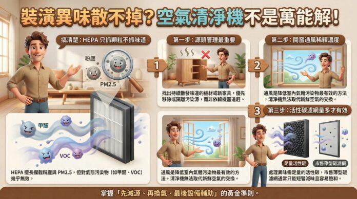 真正實用的判斷方式,不是先問「哪一台最強」,而是先問「污染是從哪裡來、屬於哪一類、現在還在不在持續釋放」。如果你家是在翻修後不久,味道集中出現在板材、膠、油漆、新家具進場之後,而且即使機器長時間運轉仍明顯聞得到,那多半代表問題核心仍偏向源頭放散與氣態污染物,這時候優先順序應該放在挑出高排放材料、移除或隔離明顯污染源,並增加室外新風交換;EPA 也把室內空氣改善策略明確排成源頭控制、改善通風、再到空氣清潔,並指出空氣清淨設備不能取代前兩者,尤其當污染源顯著且通風不足時更是如此。若你的困擾比較像施工粉塵、過敏原、細懸浮微粒,這時 HEPA 型設備的輔助價值就會比較明顯;但若主要困擾是「一直有味道、覺得悶、像化學味散不掉」,則不能把 HEPA 當成唯一解法。對氣味與部分 VOC 而言,活性碳等吸附介質可能有幫助,但 CARB 也提醒,效果高度仰賴碳材量與更換頻率,薄型碳濾網通常只能短暫減味。把這些線索合在一起,你在老屋翻修後最該建立的順序其實很簡單:先減源,再換氣,最後才讓設備做對的位置上的輔助。
