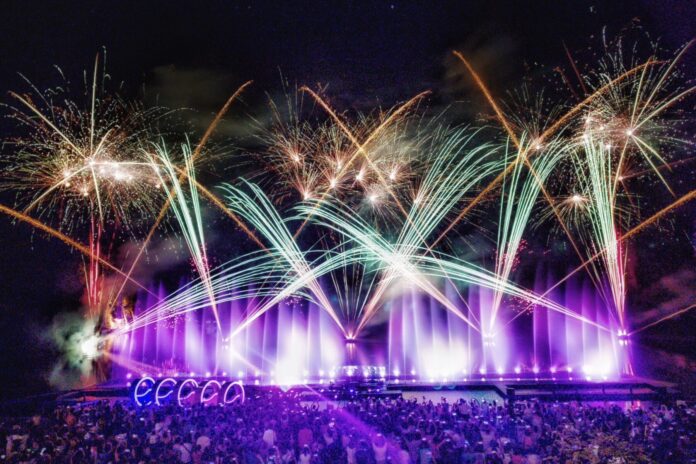 本次水舞舞台採用雙菱形構造設計,並提升整體展演深度,搭配噴水點位與動態編排,突破以往單一視覺形式,讓整體演出更具變化與張力。演出以中央25公尺大型水幕為核心,向左右軸向延展至55公尺寬度,透過雷射光雕直接投射於水幕之上,呈現立體且層次豐富的視覺畫面。今年更首度導入LED發光地磚,隨著音樂節奏與水舞同步變化,營造如同戶外Disco般的動感氛圍;中央另設置6組LED光束燈,以直衝天際的光柱象徵「碧潭之心」,展現水岸城市的生命力與希望,成為夜間最具代表性的視覺焦點。