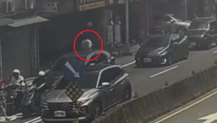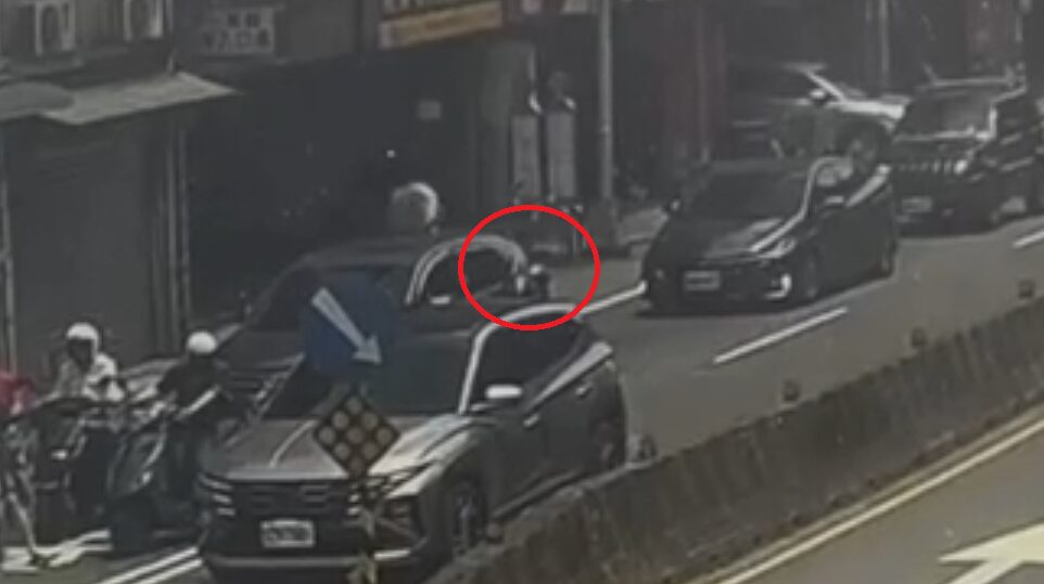 基隆香爐蓋從天而降砸傷一對共乘機車的夫妻(紅圈處)。翻攝畫面