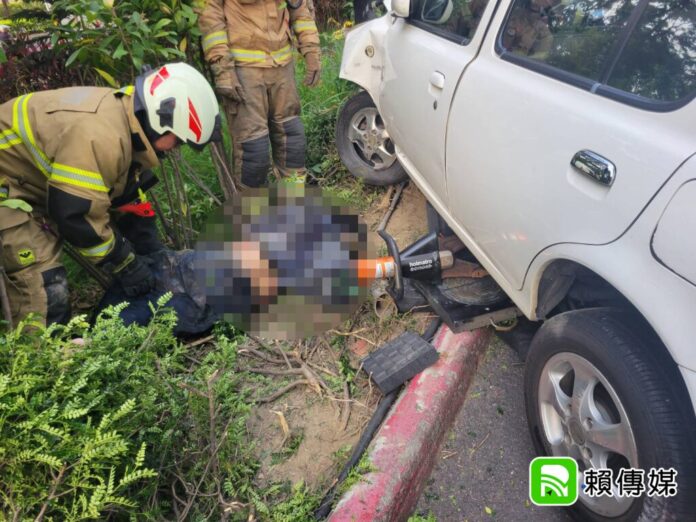 ▲消防找嘸!南科群創管制區內驚傳車禍 洽公女撞撞機車4傷1人困車底(圖/記者王俊勝 翻攝;未經授權請勿翻攝)