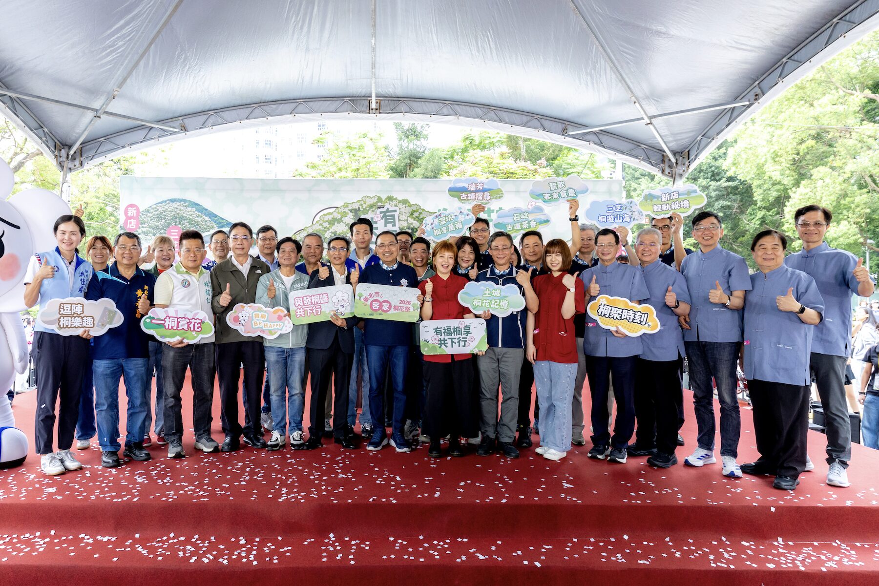春意盎然,雪白桐花提前綻放!「2026新北市客家桐花祭」(18)日於土城區捷運海山站廣場盛大揭幕,由新北市市長侯友宜、客家委員會吳克能主任秘書、新北市政府客家事務局劉冠吟局長以及土城區周晉平區長等貴賓,一起為活動揭開序幕。今年活動以「有福桐享共下行」為主題,首度推出的年度專屬代言人「發桐醬」也在眾人期盼下現身,超萌形象吸引全場目光。現場融合跨世代音樂展演、美學市集與多元互動區,吸引大批民眾到場感受客家文化與自然景致交織的春日魅力。