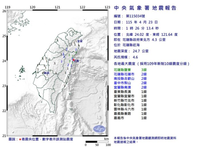 今(23)日凌晨1時26分,花蓮縣近海發生有感地震,根據中央氣象署資料顯示,地震芮氏規模4.6,震源深度約24.7公里,震央位於花蓮縣政府東北方約4.3公里海域。
