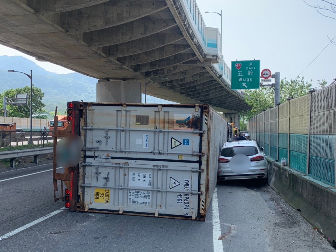 轄區蘆洲警分局八里派出所及交通分隊員警獲報後立即趕赴現場查處,發現聯結車側翻橫躺於路面,後方貨櫃更直接砸中由41歲郭姓男子所停放的白色小客車,導致小轎車被夾在水泥護欄與聯結車體之間。警方隨即於現場實施交通疏導,並通報大型吊車到場協助排除翻覆車輛,避免上班時段交通陷入癱瘓。